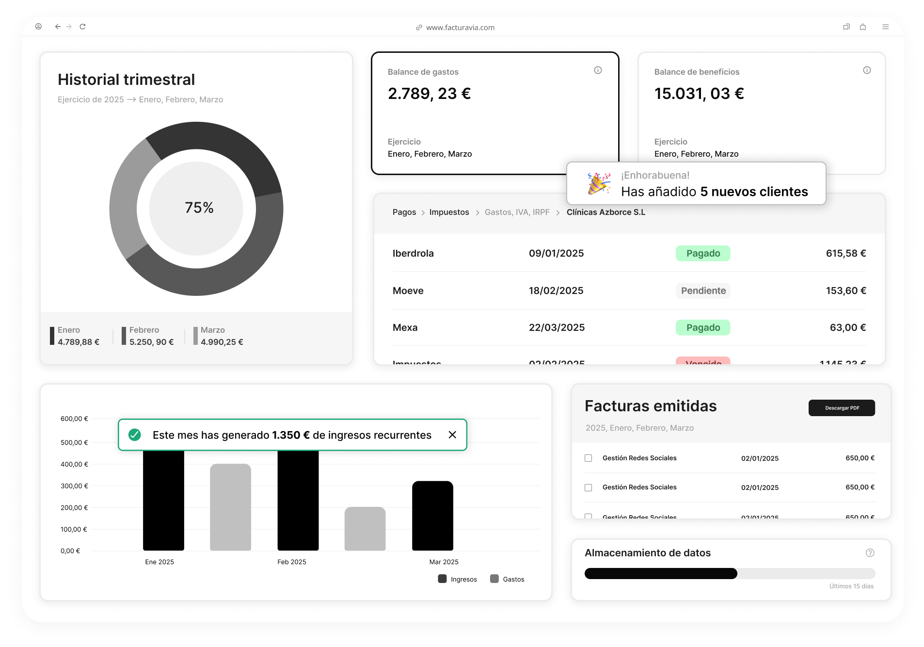 Automatiza validaciones con Hacienda y gestiona clientes sin perseguir documentos. Conecta con cada empresa desde un único panel, accede a sus datos cuando lo necesites y exporta todo a contabilidad sin revisar una y otra vez. Da igual si facturan cinco al mes o quinientas.