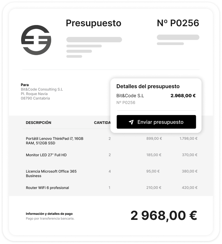 Envía presupuestos profesionales en segundos. Claros, profesionales y listos para convertir en factura con un solo clic, sin duplicar trabajo ni perder tiempo.